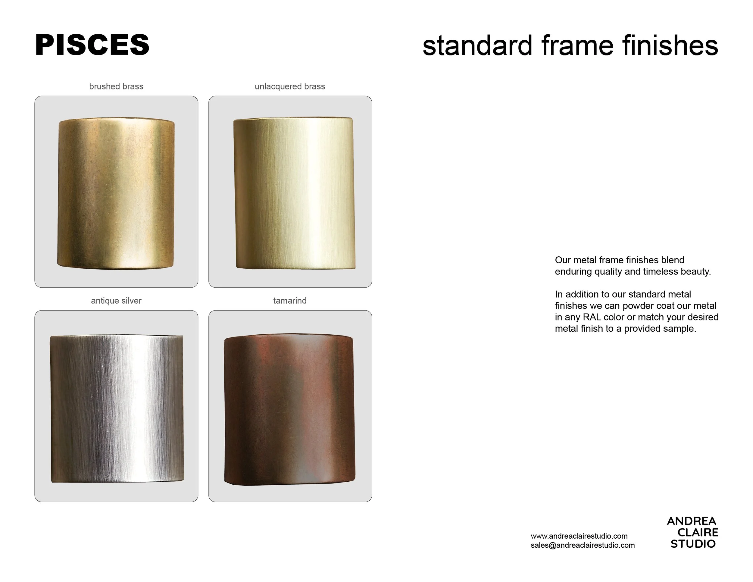 Brushed brass and Antique Silver are standard metal finishes. un-lacquered brass and Tamarind are special order finishes.