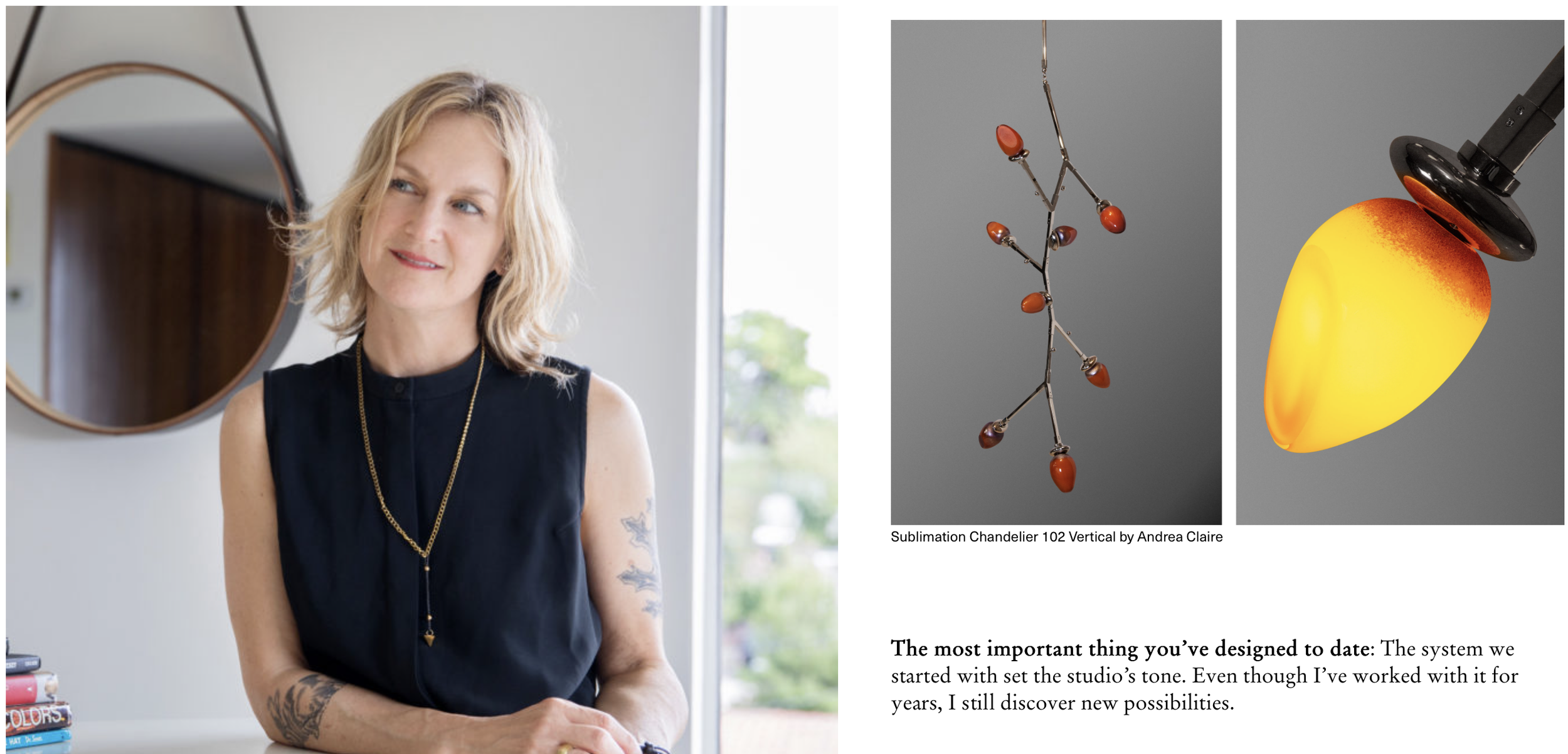 Andrea Claire’s extensive fine arts and architecture background, fine-tuned during stints working for Frank Gehry, Vito Acconci, and Rockwell Group, informs the sleek, highly detailed range of lighting she crafts in Brooklyn and Los Angeles. Making use of sculptural hand-blown glass shapes, her creations embody Japanese reverence for negative space while evoking the unmistakable contours of Calder and Brancusi.